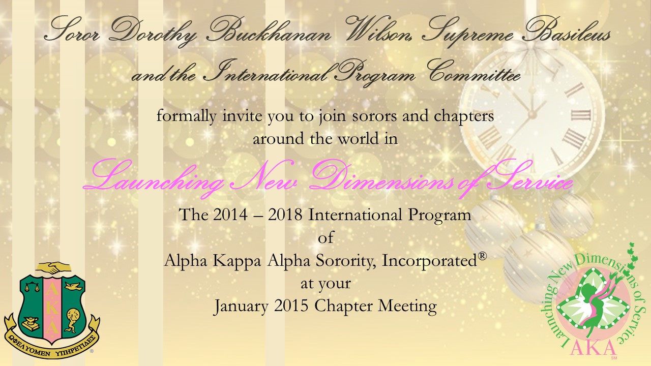 chapters as we embark on a new program year. All sorors are invited to join chapters around the world as we celebrate the official unveiling of “Launching New Dimensions of Service.” We are asking each chapter to celebrate the launch during your January chapter meeting. Activities are
